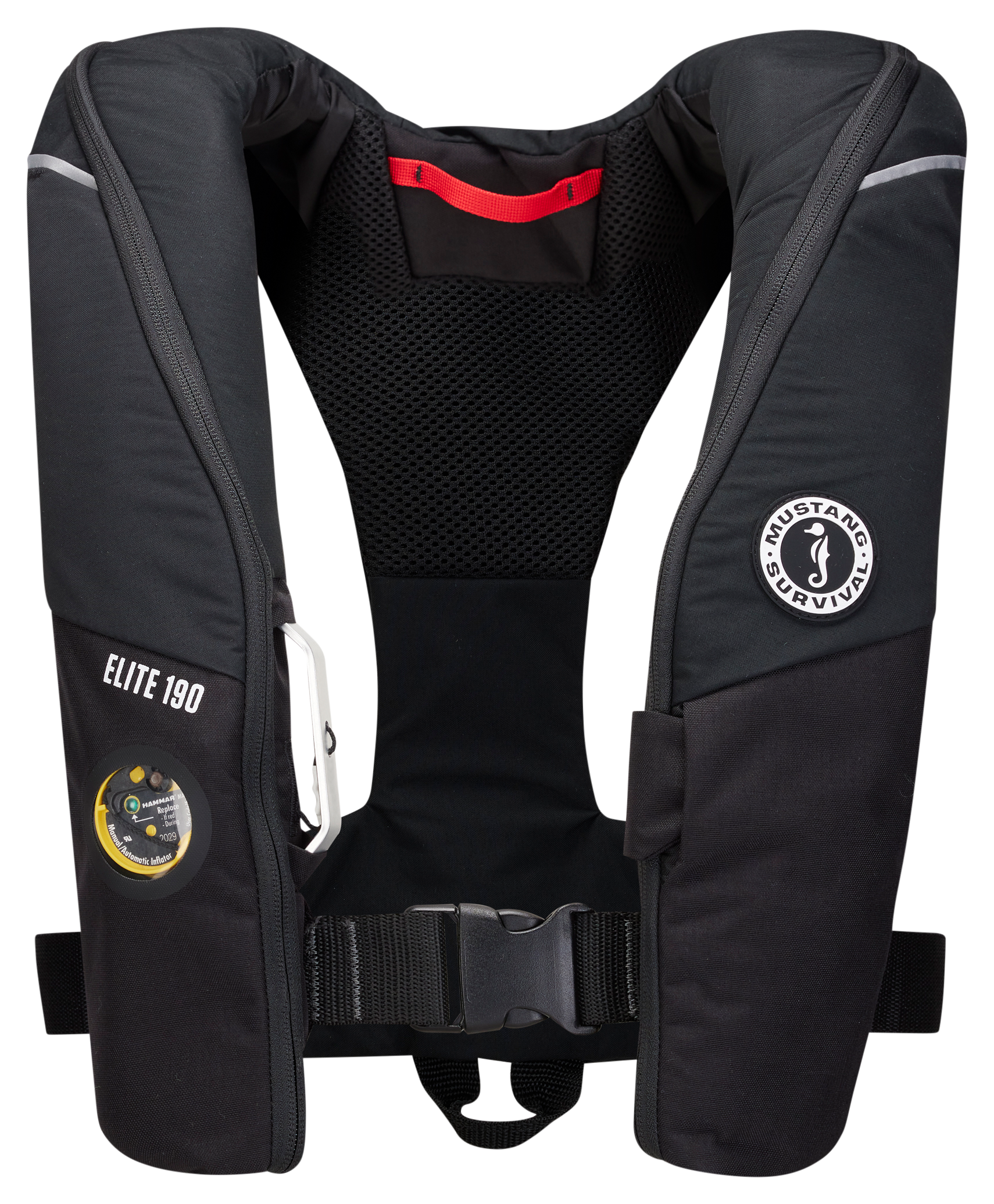 Whether you're cruising open seas or fishing offshore, the Mustang Survival® Elite 190 Inflatable Vest gives you added peace of mind. Featuring 42 lbs. of buoyancy, this life vest boasts dual approval from the U.S. Coast Guard and Transport Canada. Hammar's Hydrostatic Inflation Technology (HIT) ensures it won't inflate from rain, spray, or humidity, but inflates reliably when you need it. ADAPT Technology provides exceptional in-water turning, plus the breathable mesh back and off-the-neck design maximize comfort for all-day wear. Finished with a built-in kill-switch loop and integrated compatibility with AIS and PLB. USCG and Transport Canada-approved Type II vest. Manufacturer model #: MD3170.