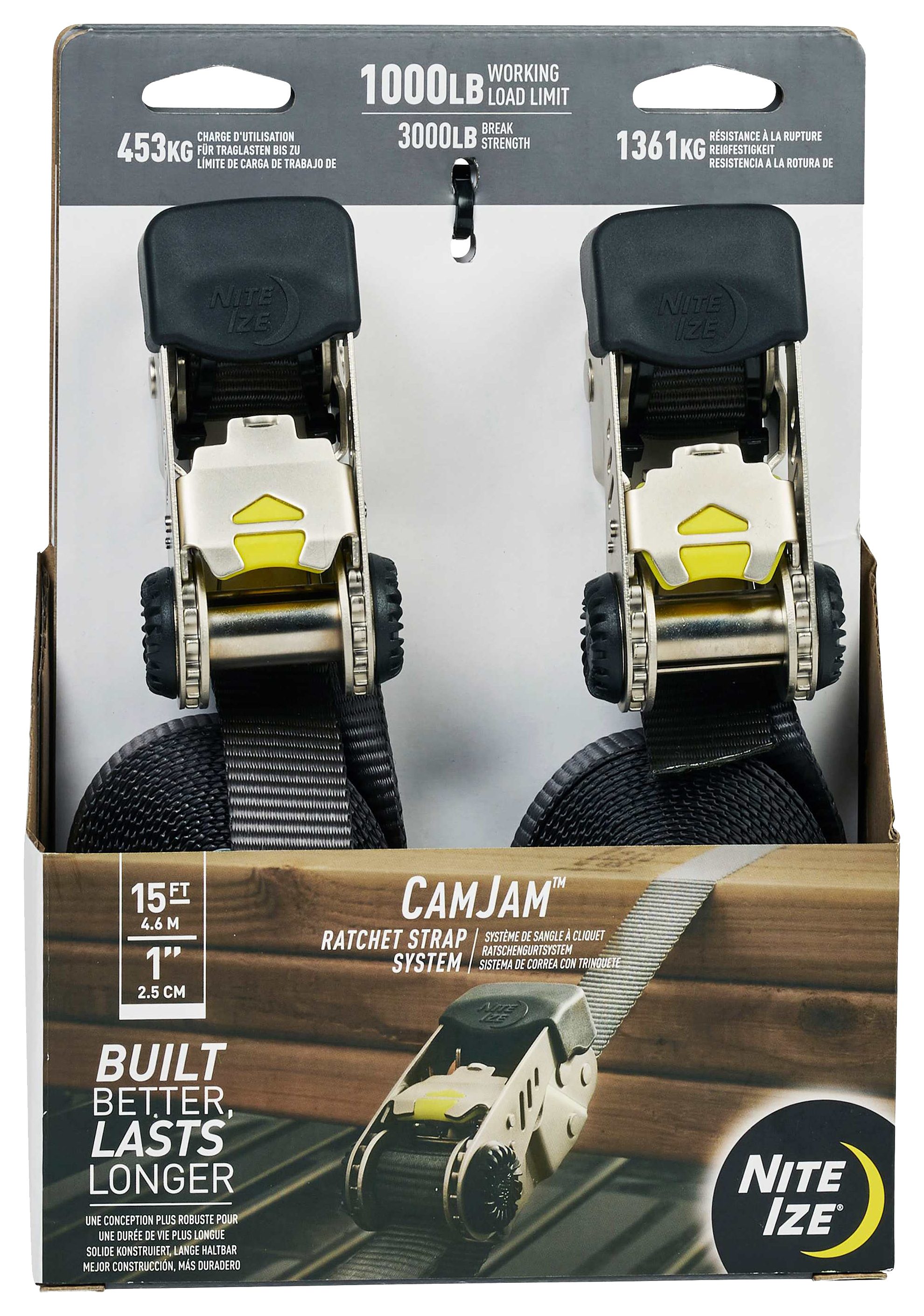 The expertly engineered Nite Ize® CamJam Large Ratchet-Strap System reinvents the ratchet strap with you in mind. The system is built better and lasts longer, coming fully stocked with 2 super-tough steel ratchets and 2 single-loop 15' polyester webbing straps. Offering the first-ever removable, adjustable ratchet, the system allows you to simply position the ratchet anywhere on the strap for ultimate device accessibility and flexibility when securing heavy loads, with a working load limit of 1,000 lbs. The stitched-in loop on the 1" strap allows you to securely attach the strap to an anchor point with a versatile girth hitch, which won't slip off like an open S-hook. When it's time to add tension, the innovative spool design allows you to easily rotate and feed the strap end into the ratchet. The built-in Tension Boost Technology™ reduces ratcheting effort by half while nearly doubling the strap tension, ensuring smooth operation and long-lasting performance, so you can travel in confidence knowing your load is secure. Once you've arrived at your destination, the patented lever pawl allows you to easily release the highest tension without the hassle and frustrations common to other ratchets. The system supports multiple configurations, including an inline and loop system.