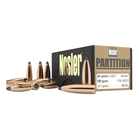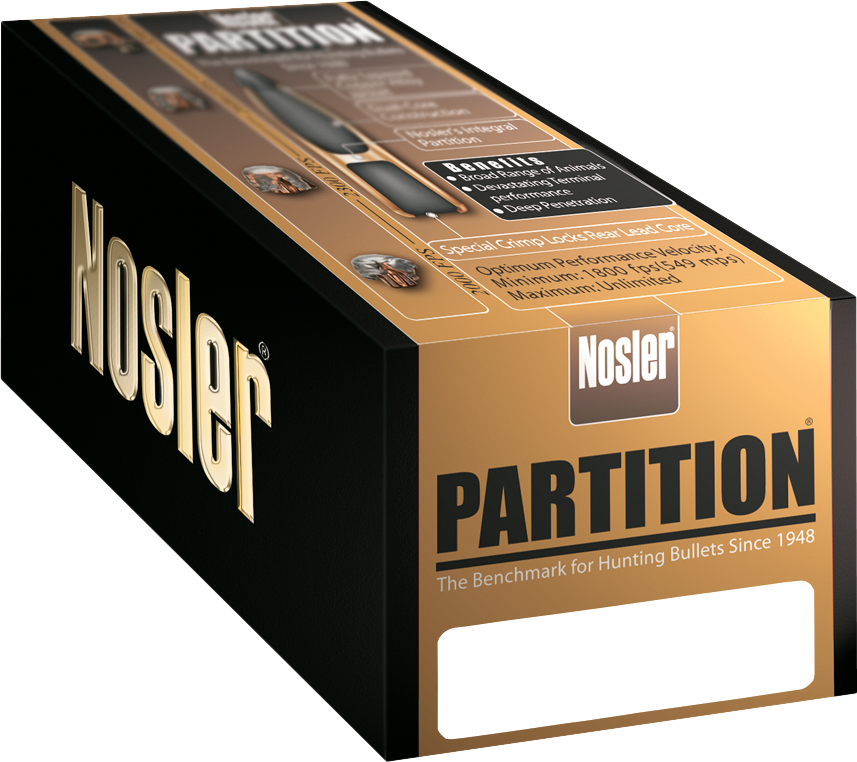 These Nosler® Partition® Bullets give you accuracy, controlled expansion and weight retention in all calibers. They are ideal for use on any game and in any situation. The fully tapered jacket ruptures instantly at the thin jacket mouth, yet the gradual thickening along the bullet's axis controls expansion and curls the jacket uniformly outward. A special lead alloy dual-core construction provides superior mushrooming characteristics at virtually all impact velocities, and Nosler's integral partition supports the expanded mushroom and still retains the rear lead alloy core. A special crimp locks in the rear core section to provide strength to resist deformation under the pressure of heavy magnums. The enclosed rear core retains more than half the original bullet weight for deep penetration.