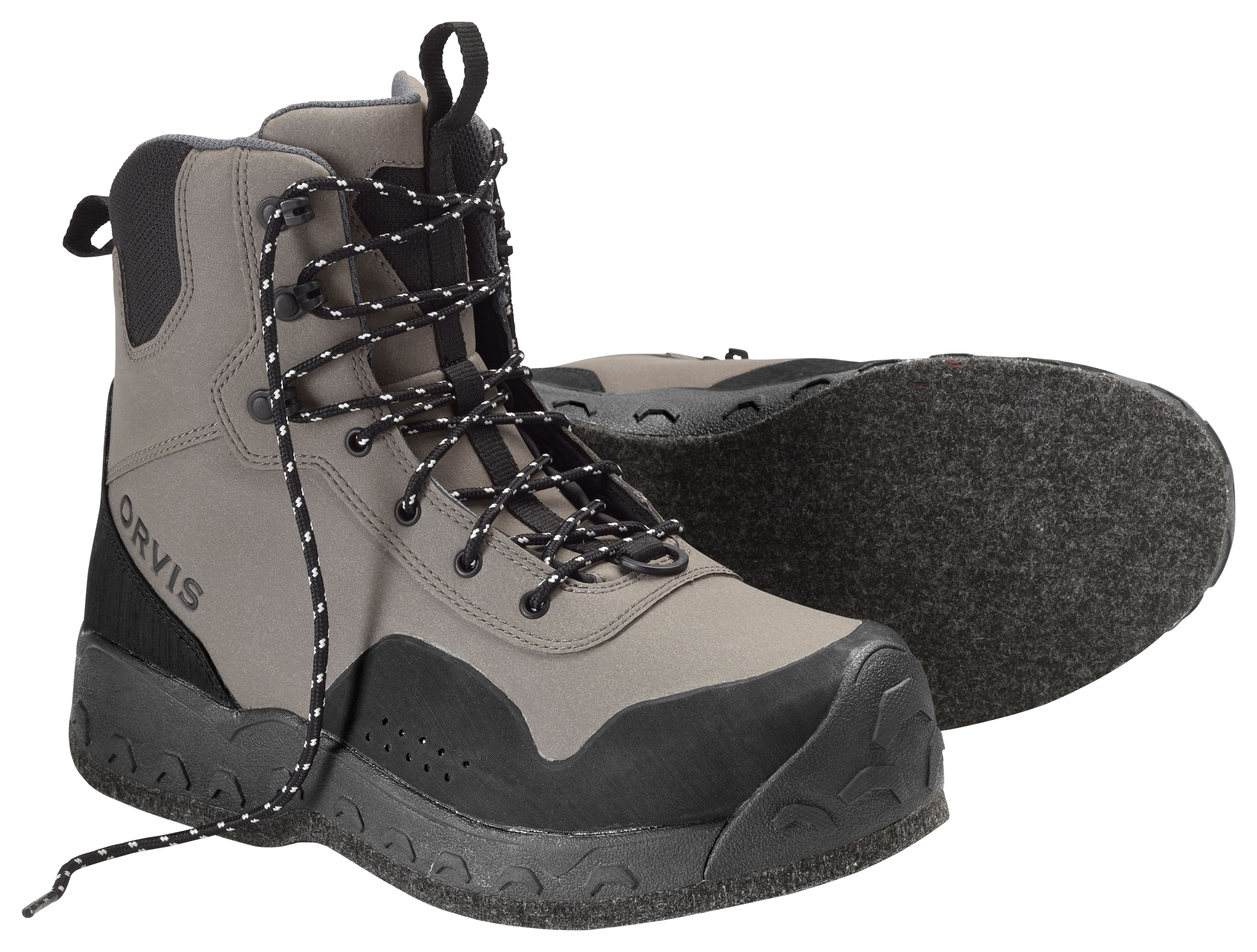 Get to the good fishing spots in protected comfort with the Orvis® Clearwater Felt-Sole Wading Boots for Men. Full synthetic-leather uppers minimize seams, ensuring feet stay comfortable in the water. Scratch rubber toes, vamps, and heel counters increase durability, while heavy-duty rubber toe bumpers protect feet from submerged rocks and debris. Plush EVA foam footbeds cushion all day long. Phylon midsoles and ESS plates provide stability and excellent stud retention. Felt soles help you stay sure-footed. Imported. Note: When sizing for wading boots, we recommend sizing 1 size up from your regular shoe size to accommodate for the added volume needed when wearing waders. Manufacturer style #: 2RAA09.