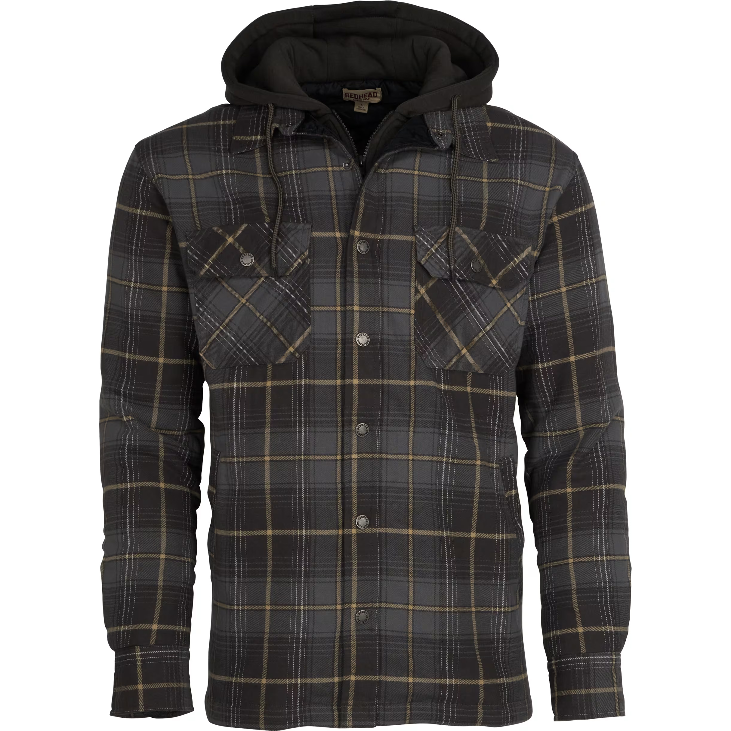 Enjoy classic cold-weather comfort in easy-going plaid styles with the RedHead® Bull Creek Long-Sleeve Shirt Jacket. Rugged 100% cotton construction offers breathable warmth for both workdays and weekends. Snap-button front over full-zip closure seals out stiff Northern breezes and the 3-piece jersey hood with drawstrings extends coverage when temperatures plunge. The men's RedHead Bull Creek shirt jacket has 2 chest pockets with snap-button flap closures for added utility. Imported.