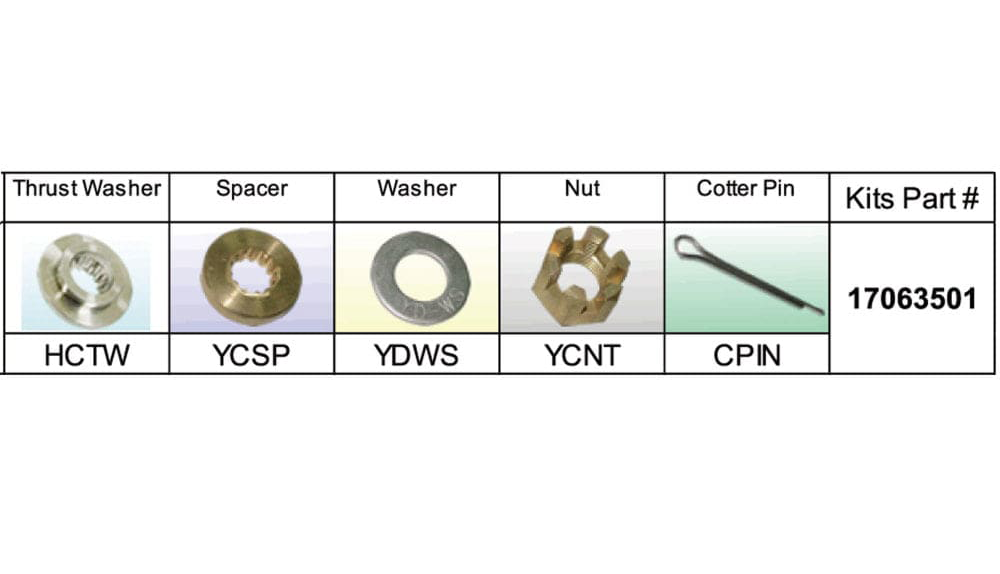 The SOLAS Honda® Type-C Fixed-Hub Propeller Hardware Kit sets you up to install a new boat propeller (not included). This prop hardware kit fits with Honda Type-C 35-60hp engines. Includes thrust washer, castle nut, space washers, and cotter pins. Nut type may vary by manufacturer. For SOLAS dual prop and B3 installations, front and rear propellers must both be manufactured by SOLAS. Also, they must be made of the same material: either aluminum or stainless steel but not both. Special tools may be required. Please consult OEM manual for proper installation and torque specs.