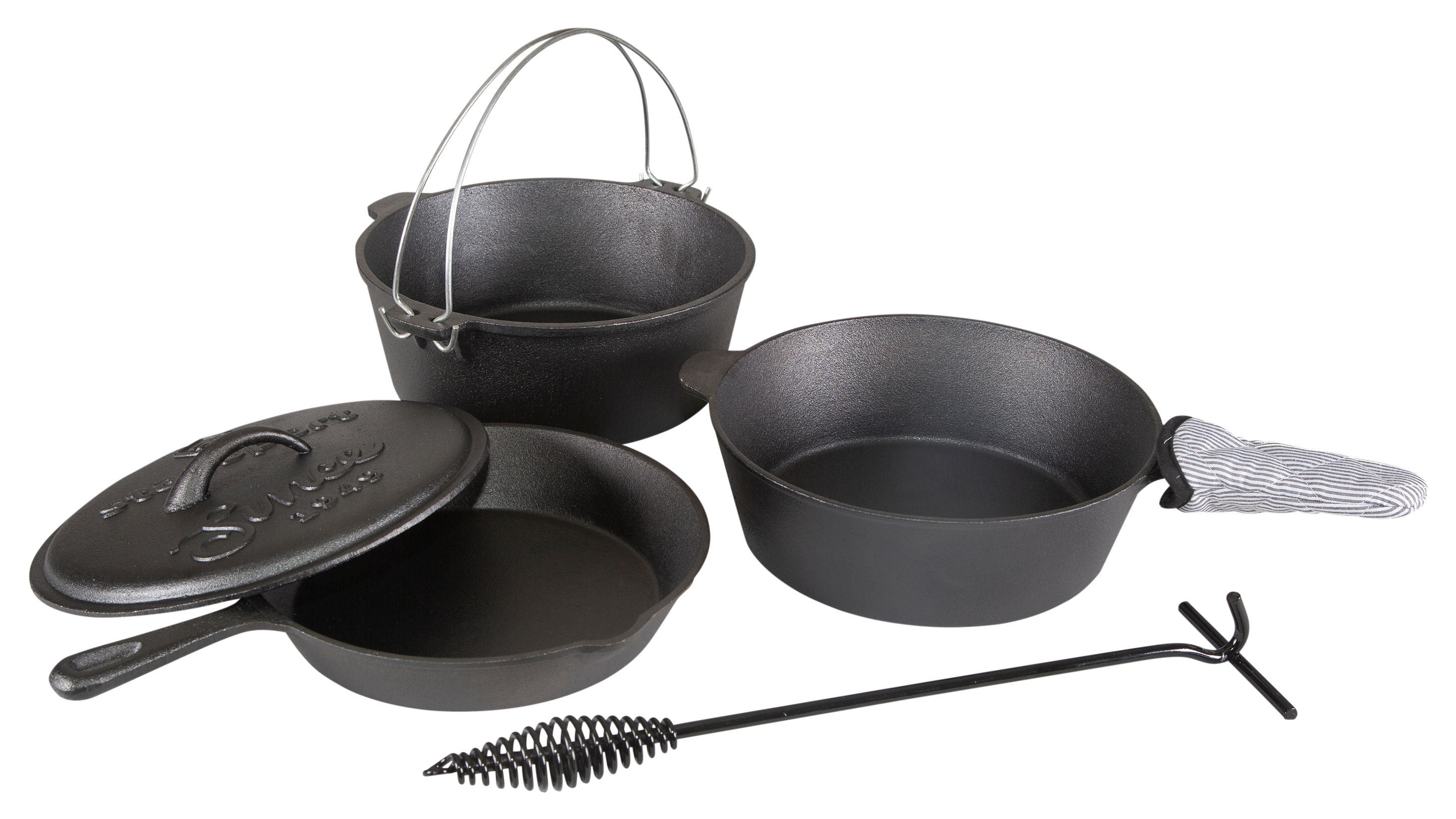 There's something special about cooking on cast iron. Discover the traditional feel and superior performance with the Stansport® Pre-Seasoned Cast-Iron 6-Piece Cook Set. Featuring a 10" frying pan, a 2.75-quart chicken fryer with lid, and a 10" Dutch oven, this Cast-Iron cook set has everything you need for a multi-course meal. Pre-seasoned and ready to use right out of the box, this Stansport cook set includes a lid lifter and a hot-handle holder. The lid is interchangeable between each piece.