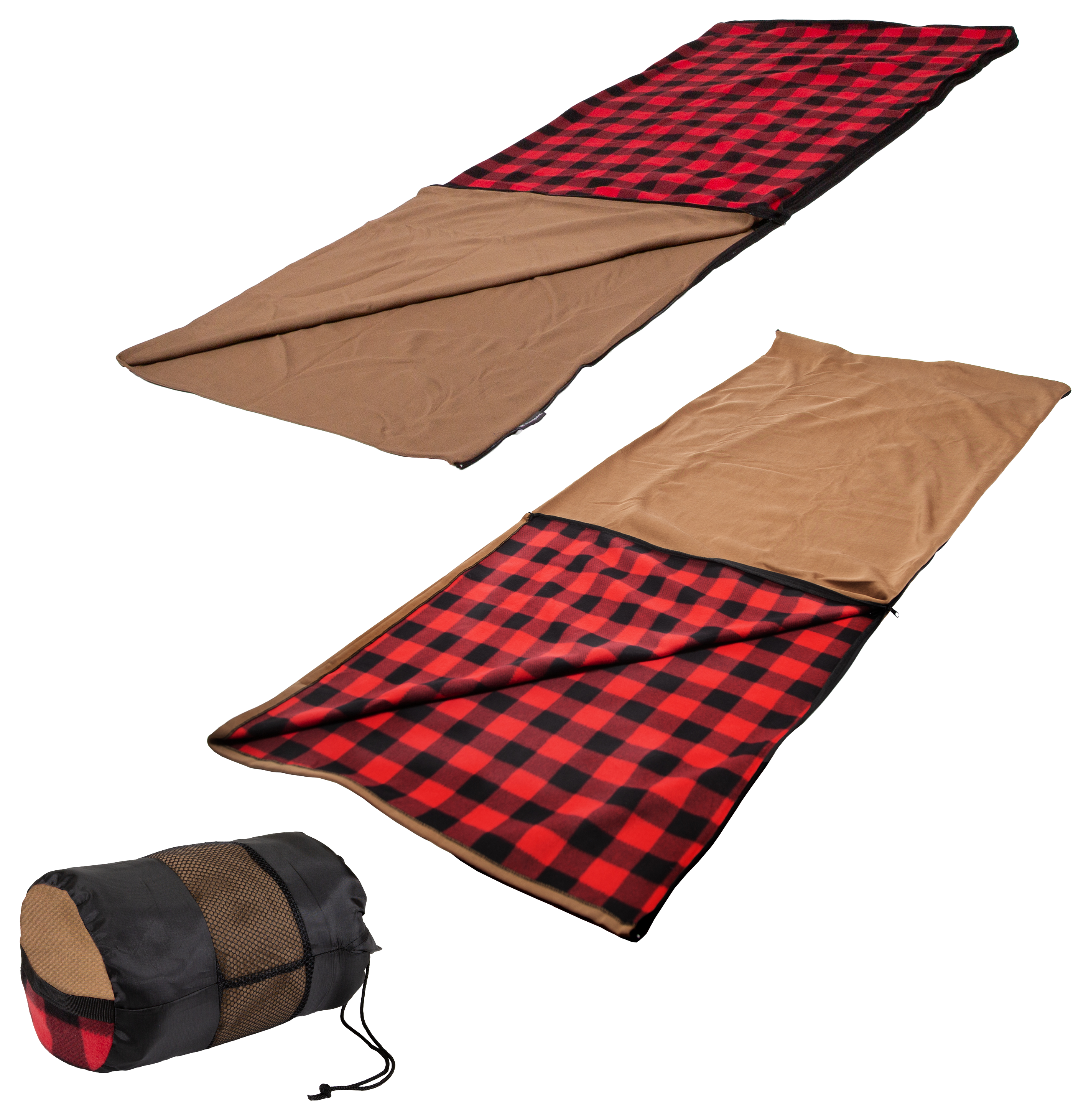 A lightweight and comfortable sleeping bag that's oh so versatile, the Stansport® Reversible Fleece Sleeping Bag offers comfortable warmth for summer camping, travel, and sporting events. Great as a stand-alone sleeping bag in warm weather or a lightweight liner in colder temperatures, this 100% polyester microfiber fleece bag also makes a great blanket or ground cover when unzipped. Versatile design also zips together with a like bag to form a double sleeping bag. Machine wash. Includes carry bag. Reversible design features red plaid on 1 side, tan on the other. 75"L x 32"W.