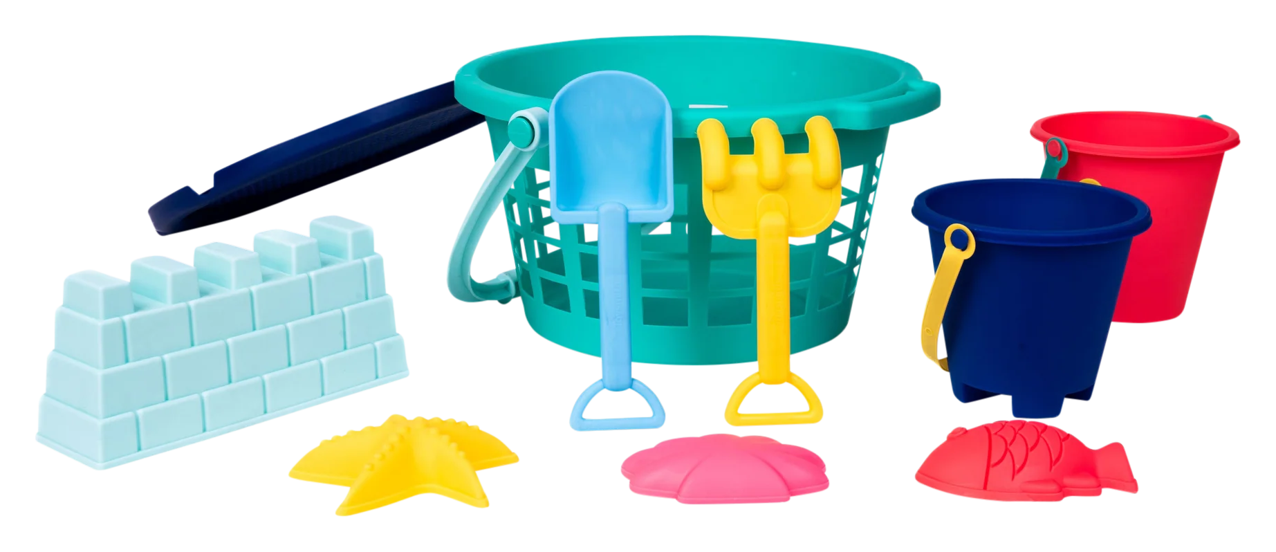The Toysmith 10-Piece Sand Bucket Set gives the next generation all they need to discover the joys of playing with sand on the beach! It comes with 3 buckets (1 large with lid and 2 small), a rake, a shovel, a sandcastle-wall mold, and 3 ocean-critter molds (a fish, starfish, and scallop). Durable plastic construction stands up to seasons of play outdoors. When it's time to return home, all of the beach toys pack into the largest bucket, and the included lid keeps everything together. Recommended for 18 months and up.