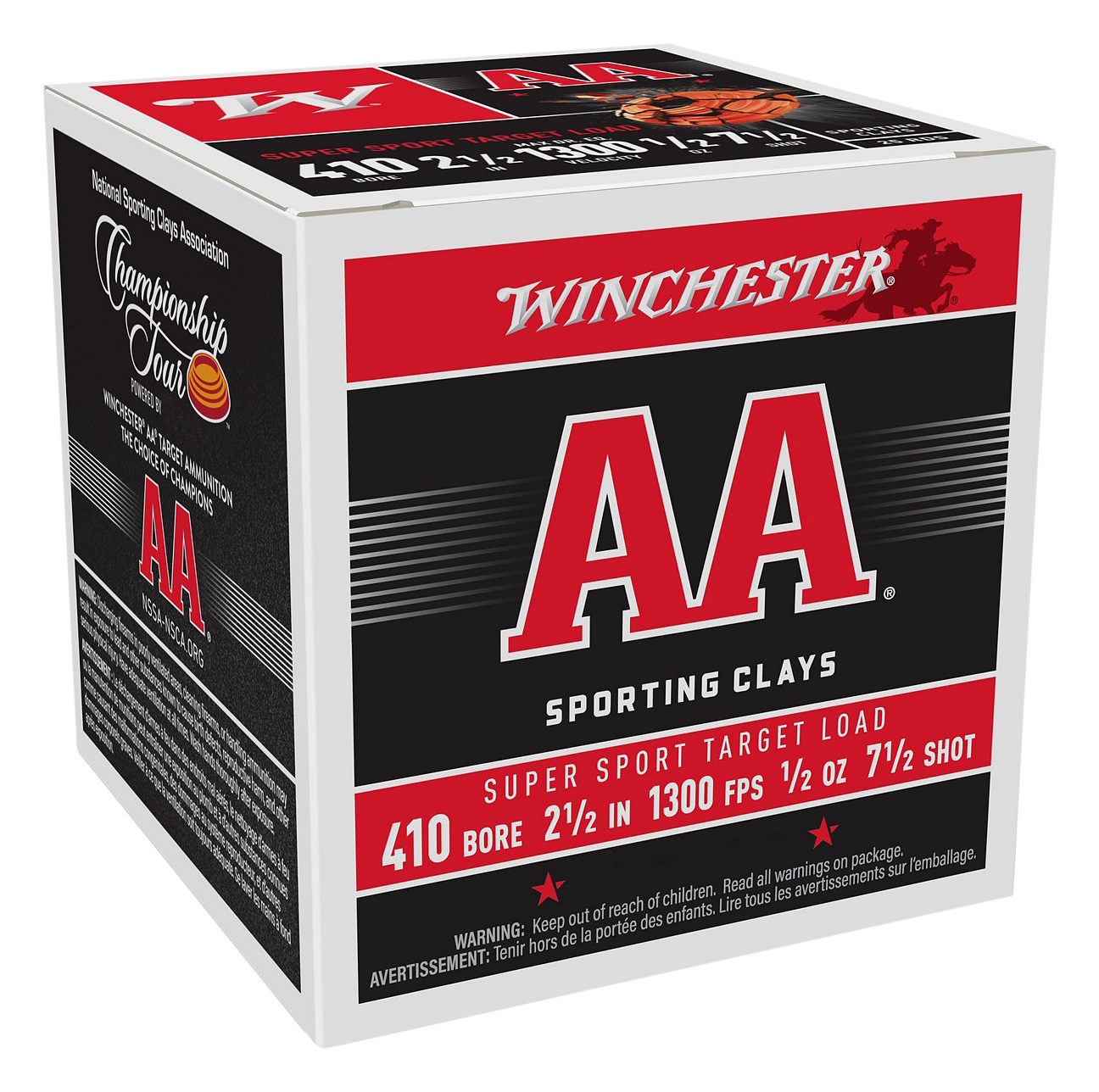 Winchester® AA® Super Sport Sporting .410 Bore 2-1/2" 1/2 oz. Clays Shotshells were designed specifically for shooting sporting clays at longer ranges. The extra heavy loads of shot and drams of powder, combined with hardened lead shot and premium AA wads, reach out to leave no doubt in anyone's mind that you've made a solid break. High quality primers and powder ensure reliable ignition every time, and help keep your gun clean and functioning properly. Winchester AA Super Sport Sporting Clays Shotshells are loaded with reloadable high quality plastic hulls and brass bases. This is also premium shotgun ammo for hunting dove, quail, ruffed grouse, and other upland game.