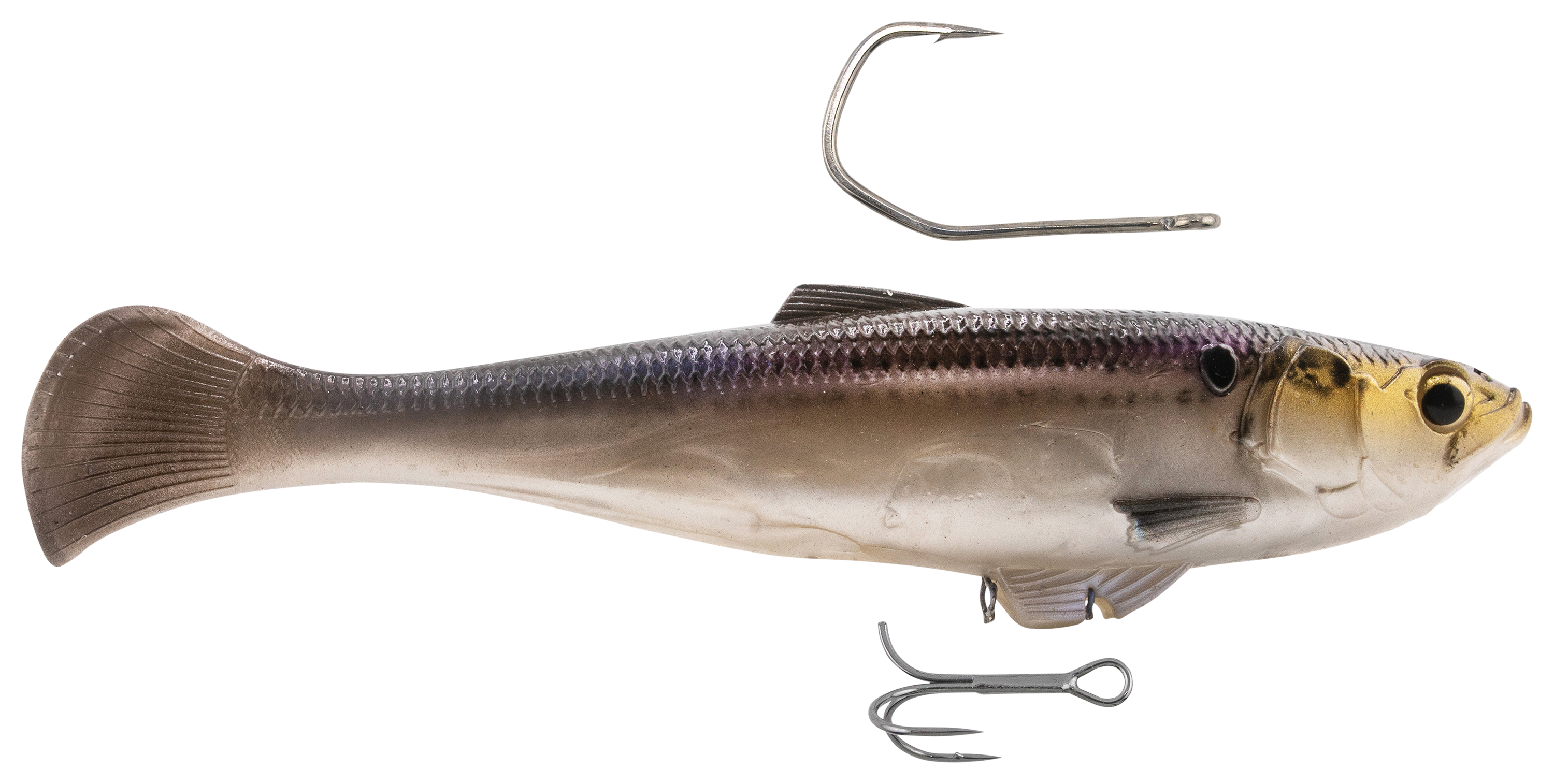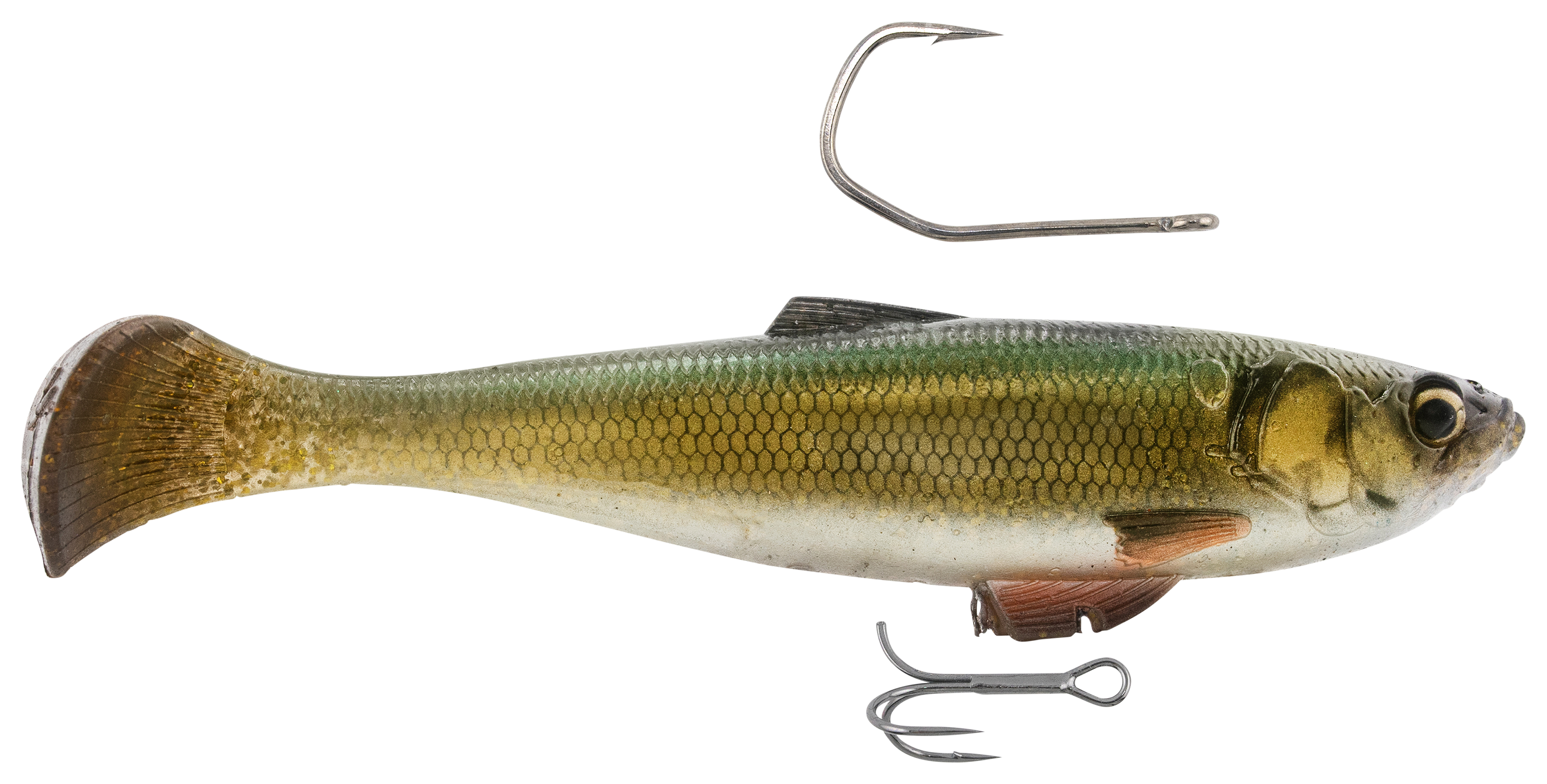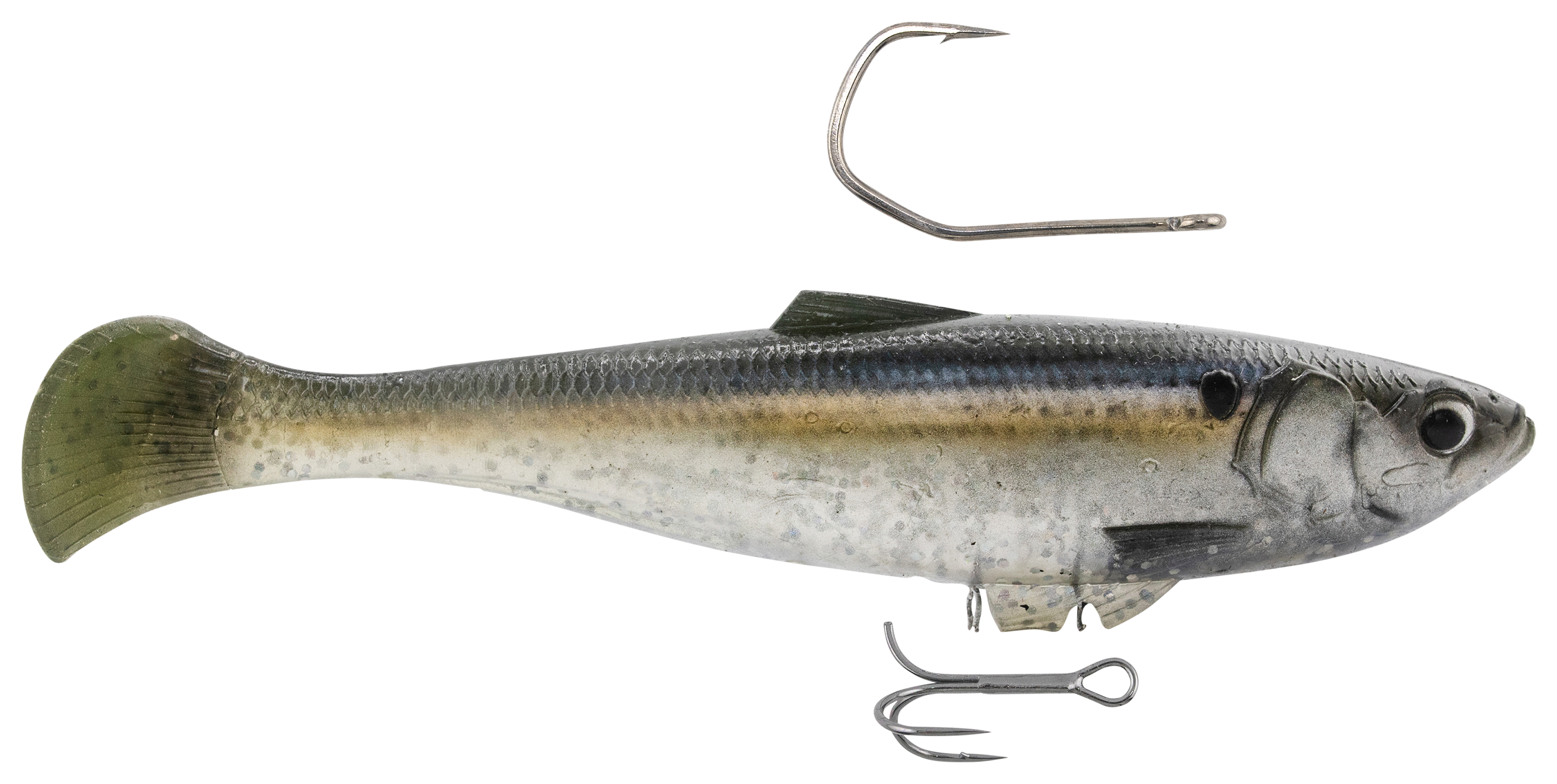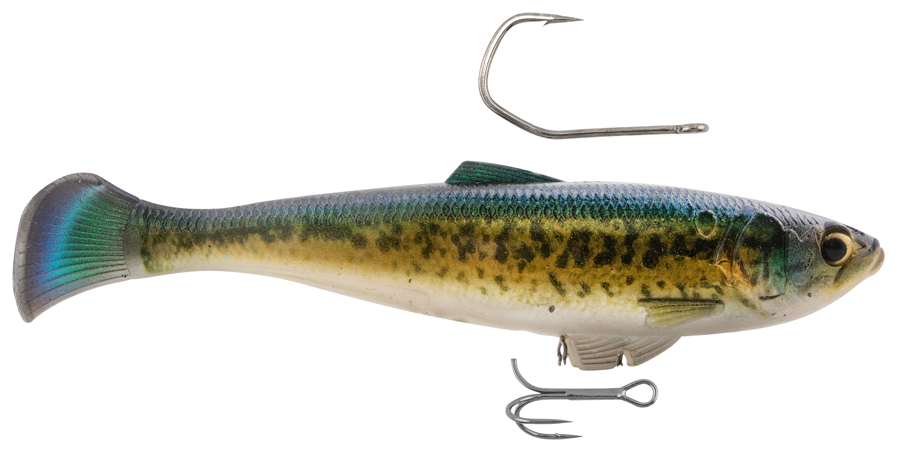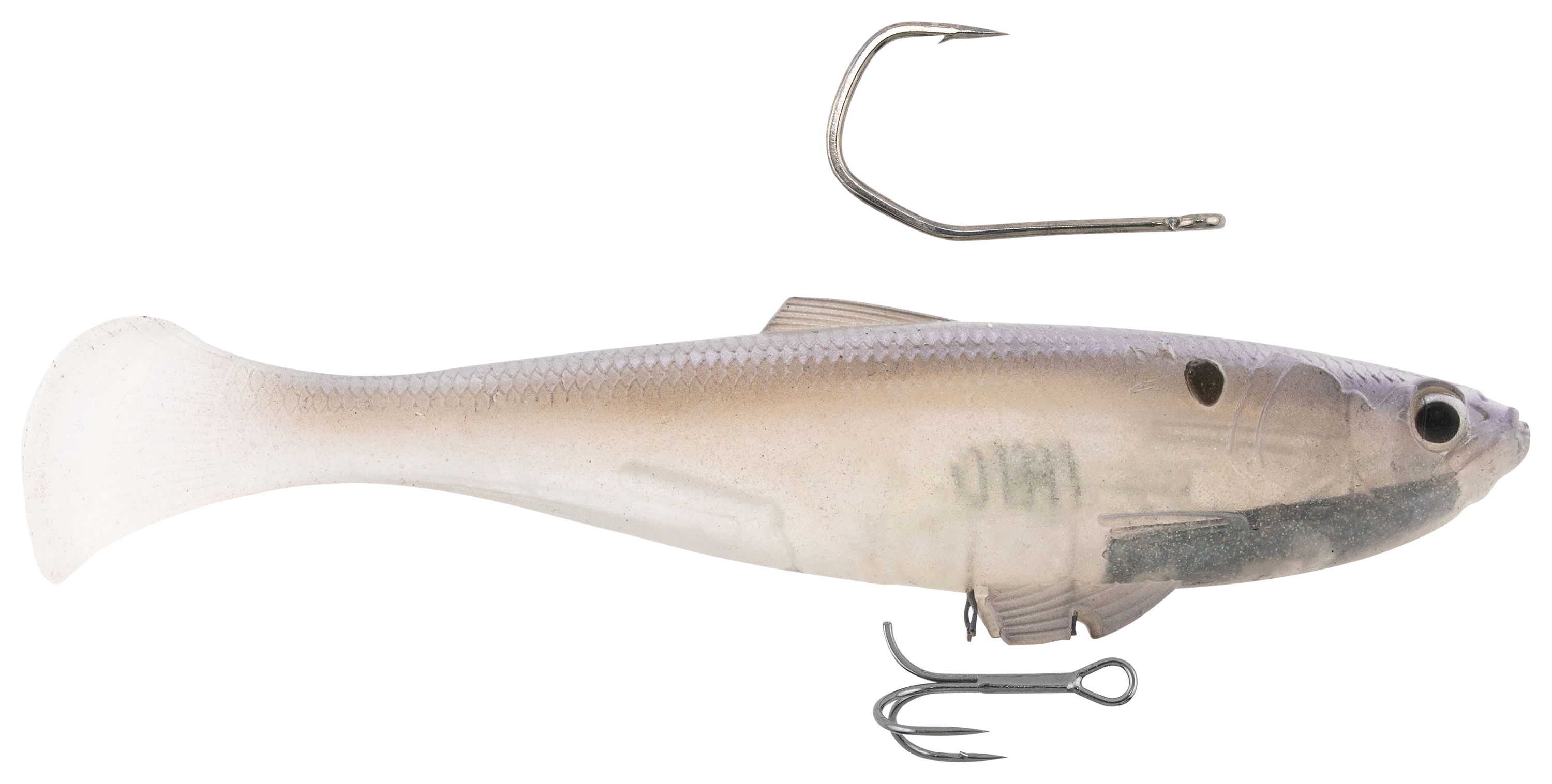 Think of the innovative Z-Man® SWAG LT Swimbait as the total fish-catching package. The hybrid keeled tail creates a wide, rolling action at any retrieve speed, while the award-winning rigging system ensures maximum versatility. You can use the 2-way Over/Under Line-Through harness for both dorsal single or belly double-hook rigging, providing confidence when working through heavy cover or targeting fish in open water. On the strike, the reinforced line-through harness slides cleanly up the line, keeping hooks pinned and preventing fish from using the lure's weight as leverage. A twin clip keeper beneath the body locks the treble tight, then auto-releases during hookset for maximum efficiency. Crafted from 10X Tough ElaZtech®, the body withstands punishing strikes and extended use while maintaining natural softness, buoyancy, and unrestricted movement. An internal glass rattle adds sound attraction, while the flat-sided profile skips easily under docks and overhangs. Finished in lifelike forage patterns, the SWAG LT from Z-Man represents a premium swimbait option for anglers targeting durability, versatility, and trophy-caliber performance. Each bait includes a heavy-duty sickle-shaped black nickel hook for dorsal rigging and a precision needlepoint double hook for underbelly setups.